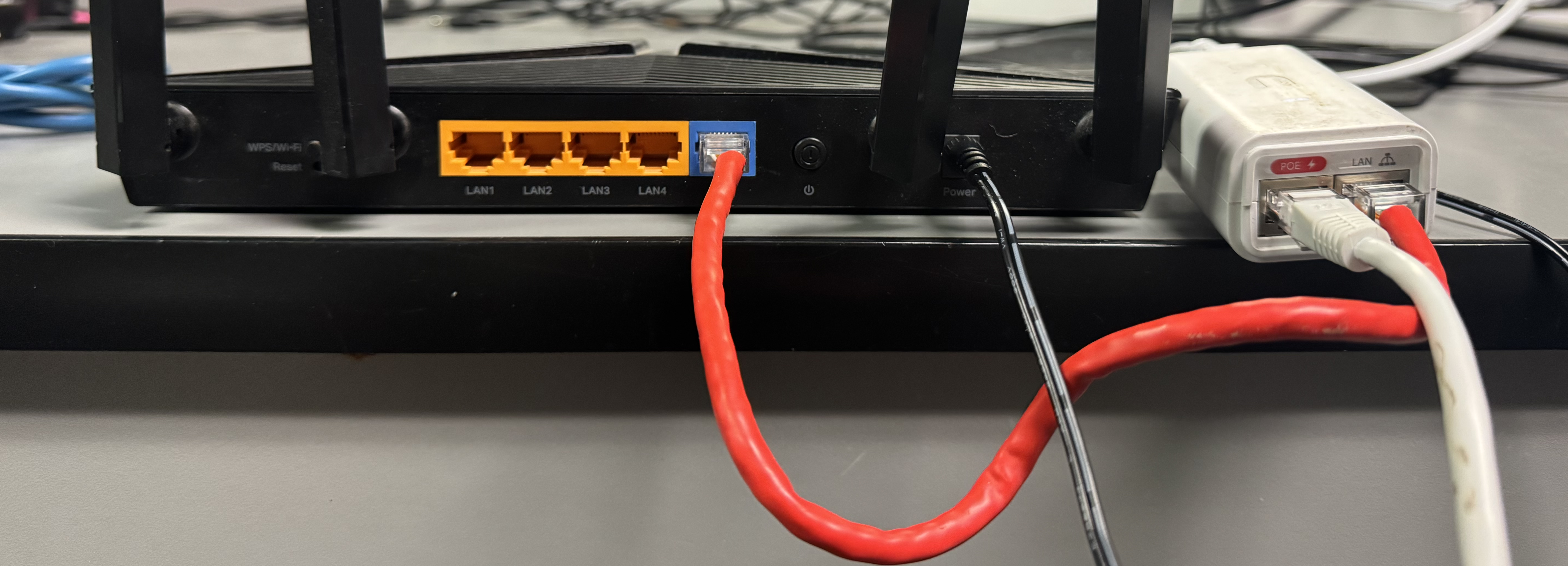 Take note of the Blue Port connected with the Red cable. It connects from the WAN port on the router into the LAN port on the white PoE adapter. In addition to this the power cable must be connected as well as the power button seen inbetween the blue WAN port and the power cable. In this model the white cable will be coming in from outside.